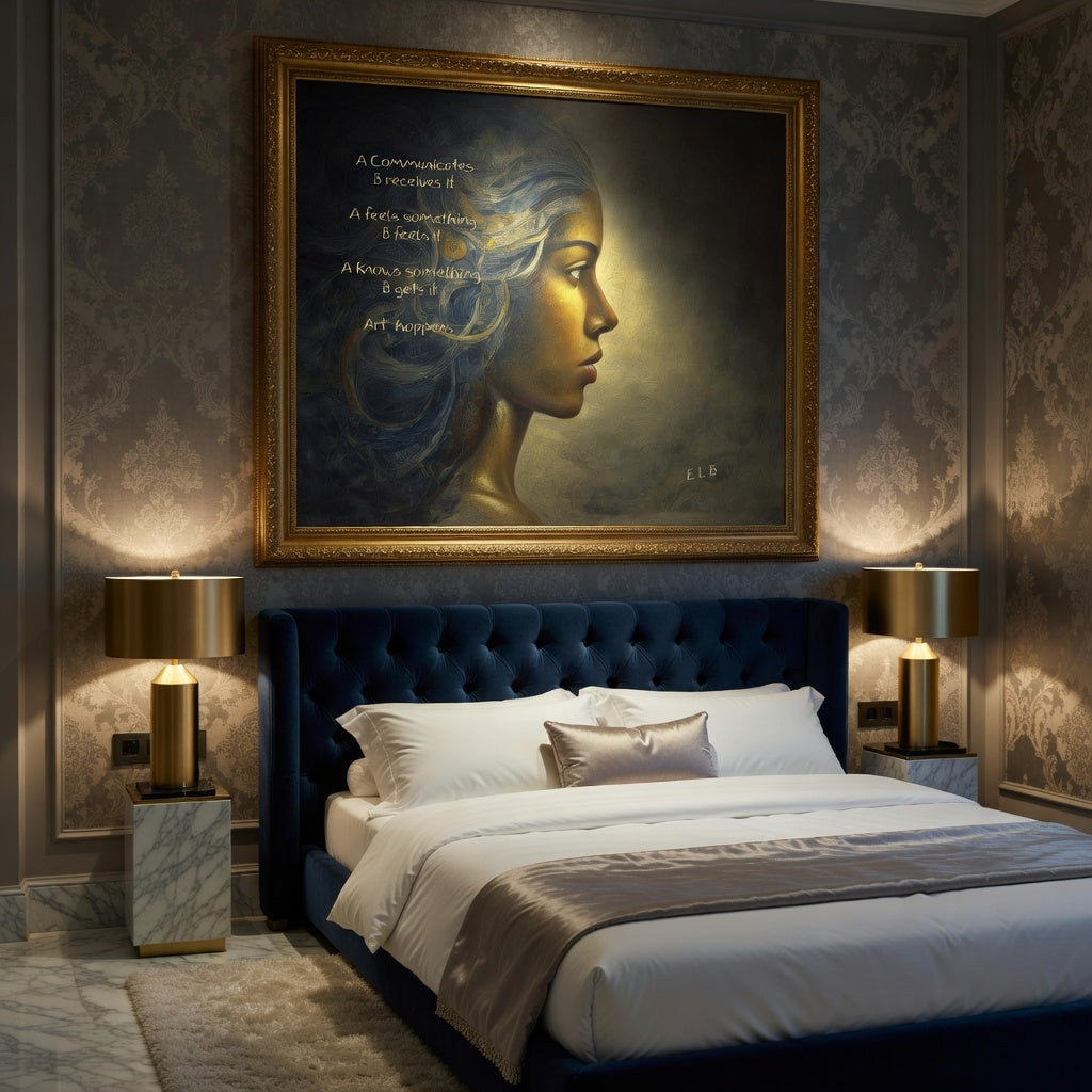 "Art Happens" captures the silent miracle of creation and reception. A paints, feels, knows. B receives, feels, gets it. The poem traces the invisible bridge where one soul’s expression meets another’s understanding, word and image merging in quiet alchemy. Restrained yet luminous, the canvas breathes the essence of art: not in the making alone, but in the shared moment when A communicates and B truly hears, when feeling becomes mutual, and knowing becomes connection. A timeless portrait of the sacred exchange that defines every true encounter with beauty.