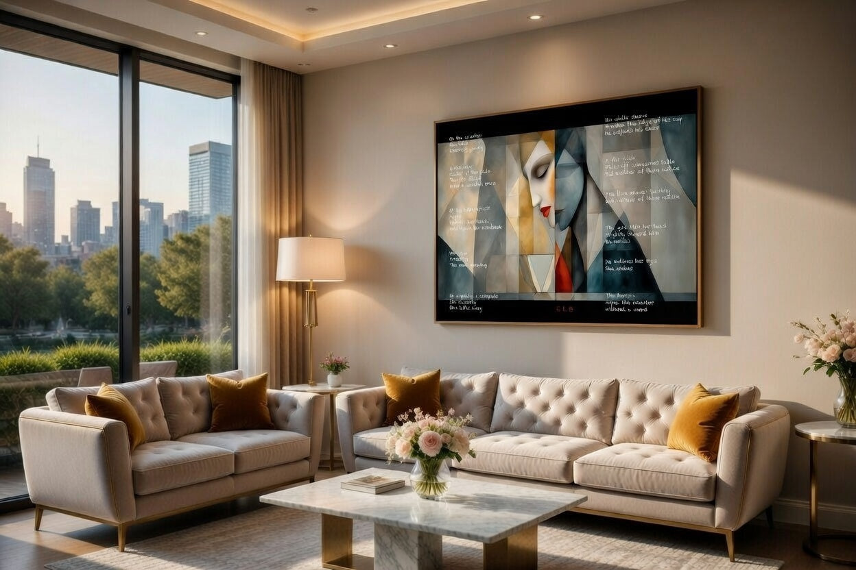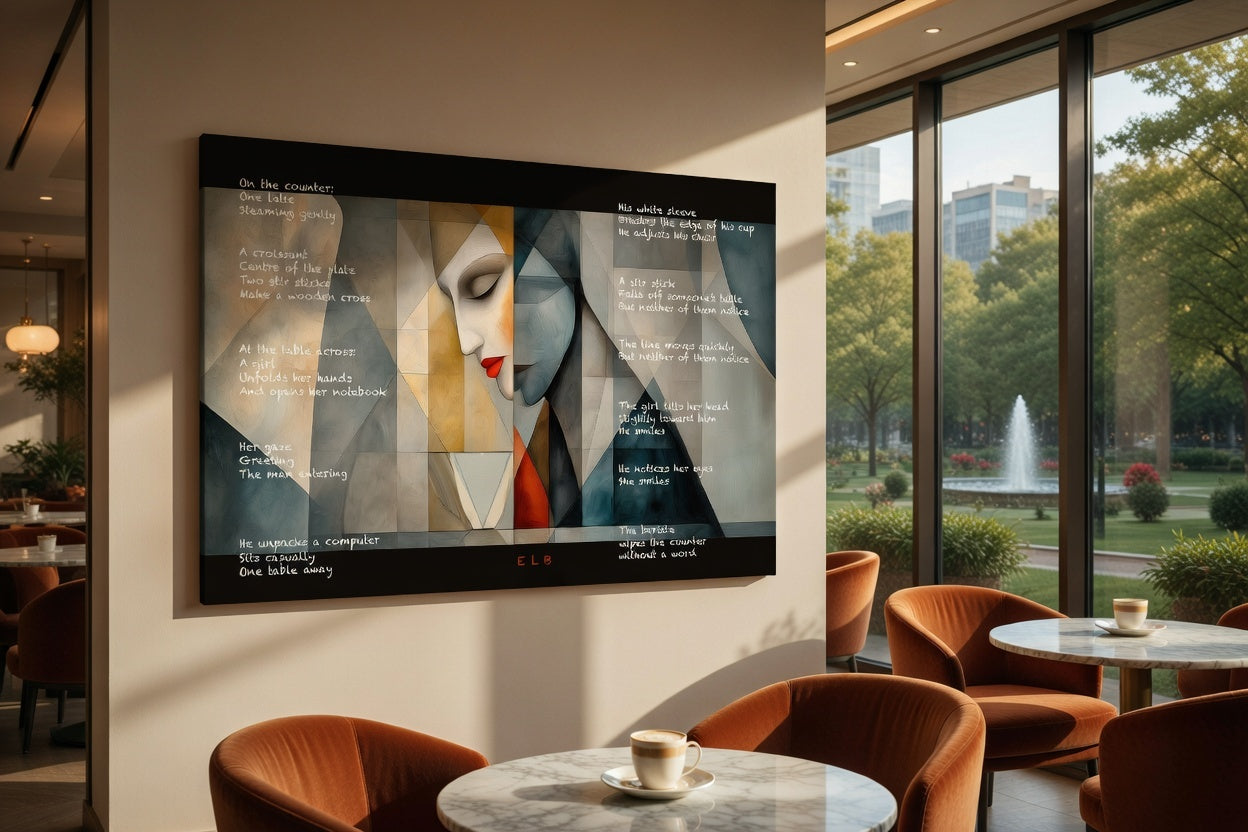 In the hush of a morning café, two strangers meet across tables and time. A fleeting glance, a quiet smile, the soft clink of porcelain, where silence speaks louder than words. Painted Poem by E. Laurence Bake, woven in gentle geometric light, whispering that connection arrives unannounced, needing only presence to bloom.
