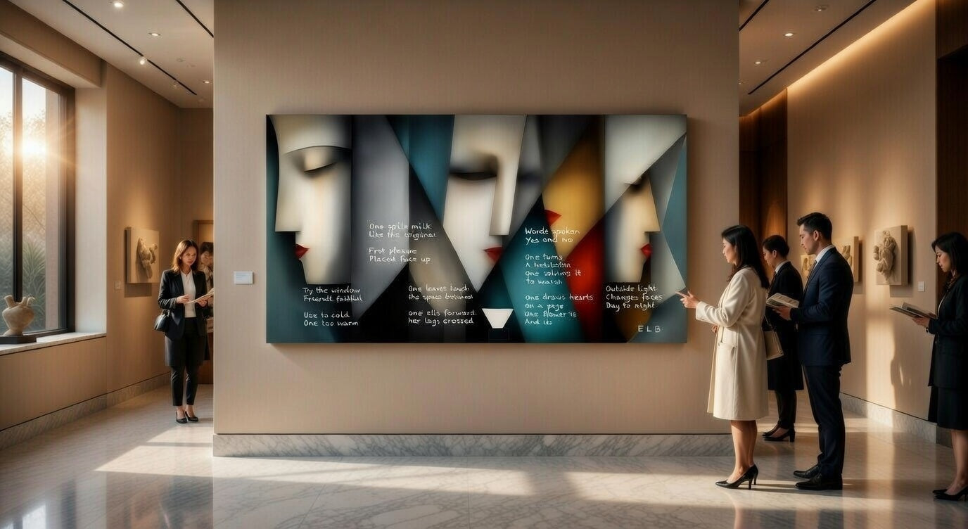 Where a café's quiet whispers unfold in geometric grace. Words of yes and no drawing hearts and light across the edge of day and night. Painted Poem by E. Laurence Bake, a meditative invitation to presence in the simple, where five phones lie silent and connections bloom unbidden.