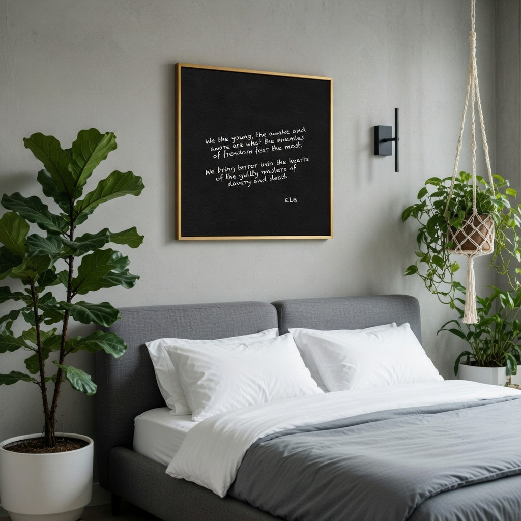 A stark philosophical declaration, "Enemies 2" overlays defiant white text on a deep black canvas. "We the young, the awake and aware are what the enemies of freedom fear the most. We bring terror into the hearts of the guilty masters of slavery and death ELB." The minimalist composition evokes raw introspection on empowerment, tyranny's self-inflicted terror, and the awakening's resonant power.